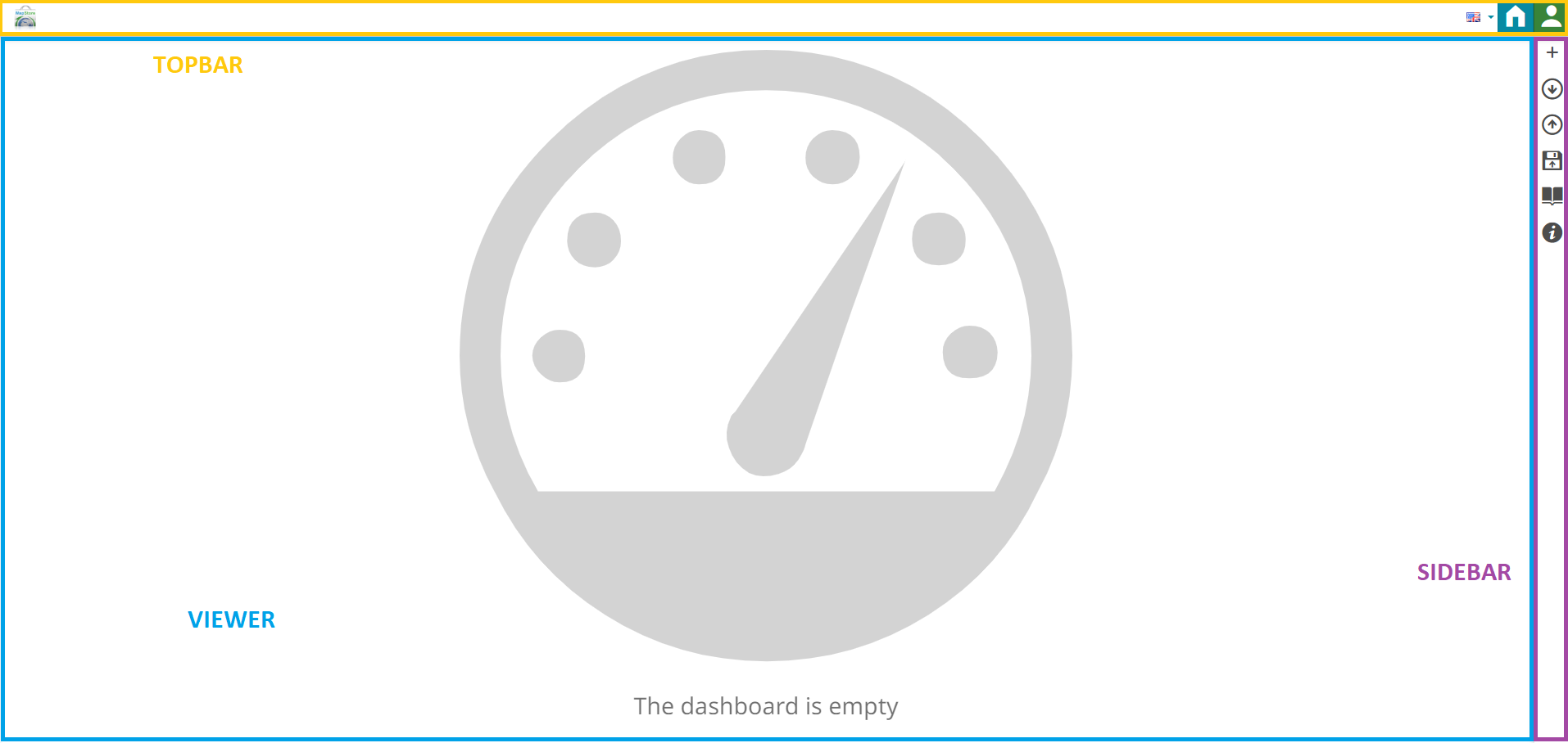 appears in MapStore Homepage once logged as Administrator or Normal user. With a click on it, an empty dashboard workspace appears. This page is composed of a Topbar, a Sidebar and a Viewer: