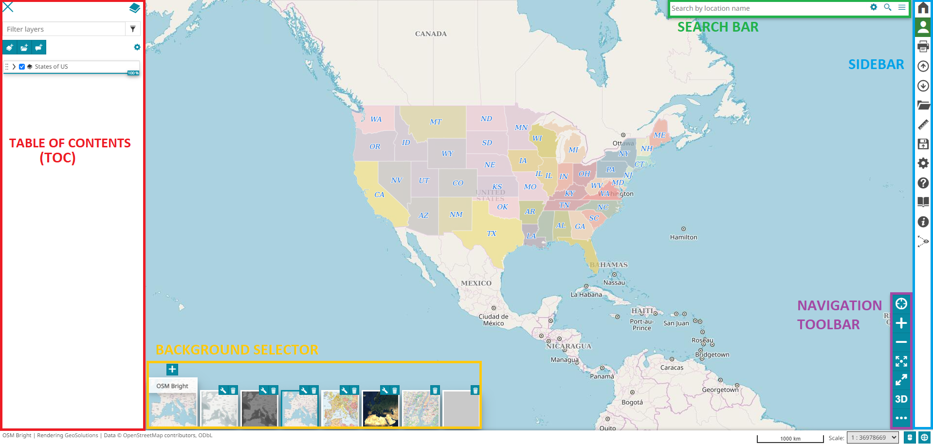 The MapStore Toolbars includes the Search Bar and the Side Toolbar, an important list of options that contains several functions and information