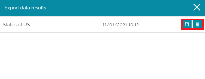 The Export Data Result provides the list of exports processes started by the user and their status: as soon as the WPS completes the export operation, its status is reported by MapStore to the user (in progress, completed, and so ready for download, or failed). Therefore, the user can: