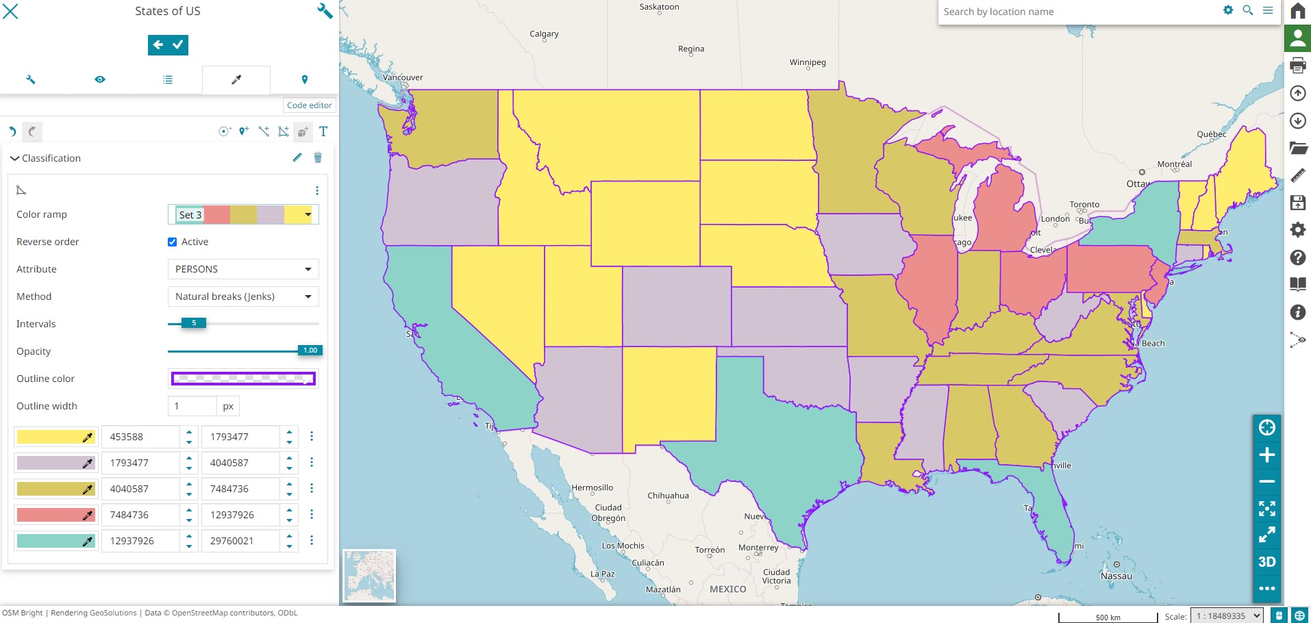 It this case the editor is allowed to choose a Color ramp and the order (with Reverse order) of the classification intervals colors. It is obviously possible to select the layer Attribute to use for the classification along with the classification Method (Quantile, Equal interval, Natural breaks and Standard deviation), the number of classification Intervals and the Opacity (%) of each interval range. An example of the Classification style for a Fill rule type can be the following one: