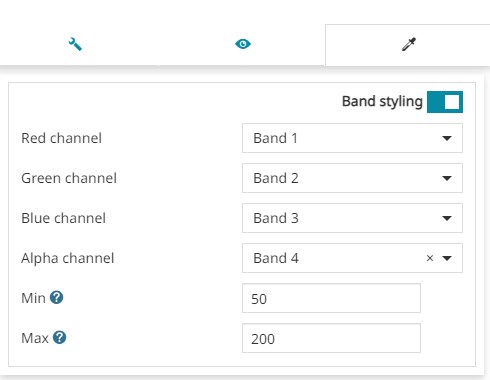 Enabling the Band styling section, here the editor can associate the Channels (Red, Green, Blue and Alpha) to the Bands of the COG layer and set the minimum (Min) and maximum (Max) source data value. Take a look at the following example.