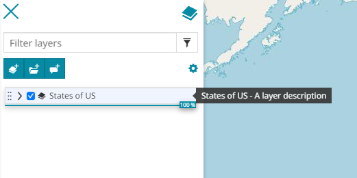 Configure the Tooltip that appears moving the cursor over the layer's item in TOC. In this case the user can decide that the Title, the Description, both or nothing will be displayed. Moreover you can set the Placement of the tooltip, choosing between Top, Right or Bottom: