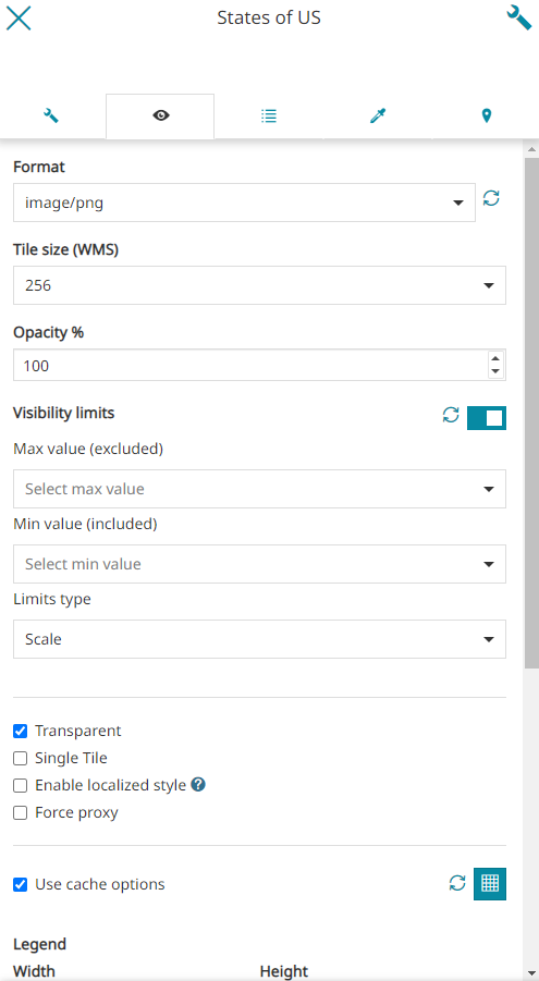 Enable/disable the use of the layer cached tiles. If checked, the Tiled=true URL parameter will be added to the WMS request to use tiles cached with GeoWebCache. When the Use cache options is enabled, more controls are enabled so that it is possible for the user to check if the current map settings match any GWC standard Gridset defined on the server side for the given WMS layer (Check available tile grids information
