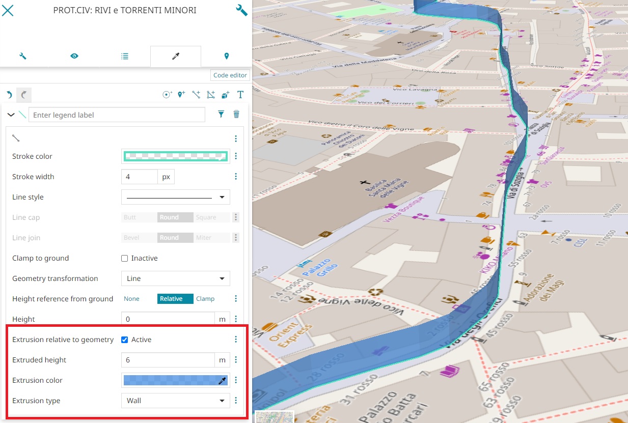 - Extrusion Height (available for Line and Fill symbolizers) to configure the height value of the feature to be extruded. It is also possible to enable/disable the Extrusion relative to geometry (from the highest point of the feature geometry) and, only for the Line symbolizers, the user can customize the Extrusion color and the Extrusion type, choosing between