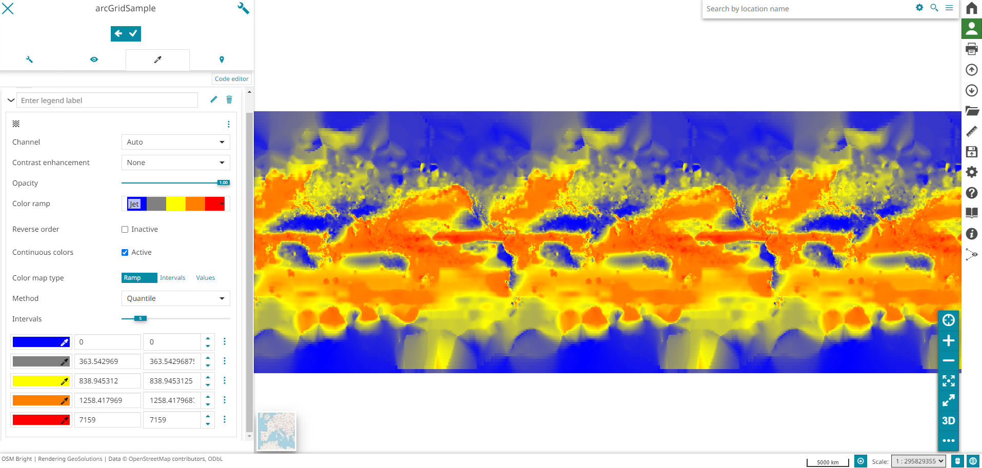 With the Pseudo color the user has the possibility to customize the Single band with a Color ramp. In this case, in addition to choosing Channels, Contrast enhancement and Opacity, the user can select Color ramp, enable Reverse order and the Continuous Colors, choose the Color map type (Ramp, Intervals and Values), the Method (Quantile, Natural breaks, Equal interval and Unique interval) and modify the Intervals. Take a look at the following example.