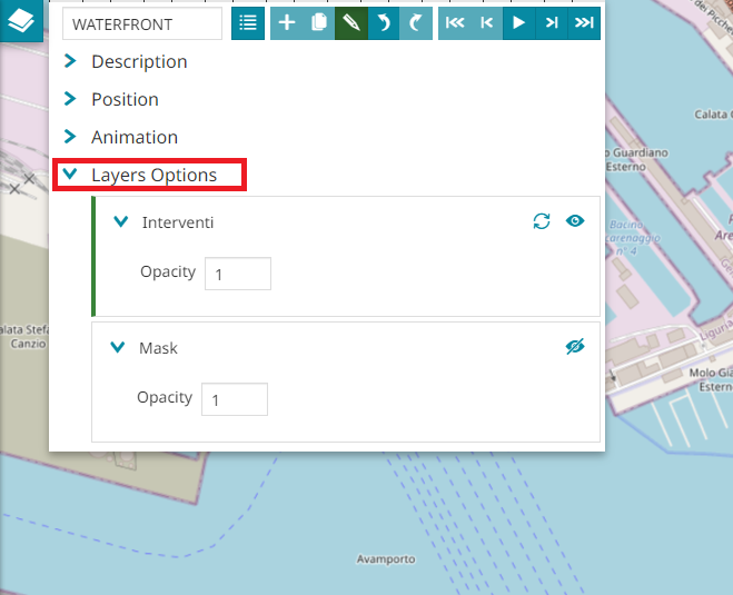 - Choose which layer should be visible when the view is active through the Layer Options section. In 2D mode the user can simply enable or disable all the layers present on TOC and change the opacity.