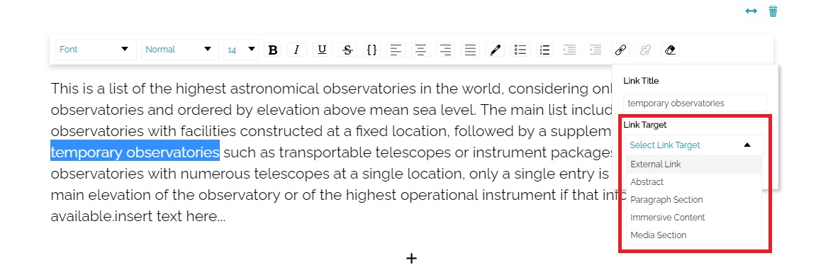 to configure a hyperlink for the selected portion of text. The GeoStory editor can define hyperlinks to external web pages by choosing the External link option in the Link target dropdown menu and entering the related URL. As an alternative, it is also possible to define a hyperlink to other sections of the same GeoStory by choosing one of the sections available in the Link target dropdown menu.