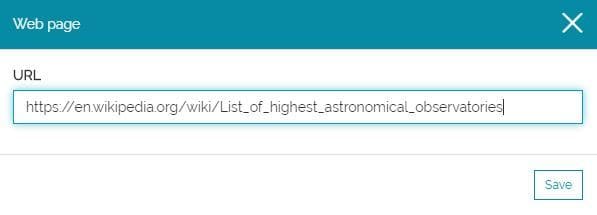 Through this kind of sections the story editor can embed third party contents in the story (like other web pages available on the web). The Web Page Section is similar to the Paragraph Section and the Media Section: adding this section a modal window opens to specify the URL of the web page that is going to be added.
